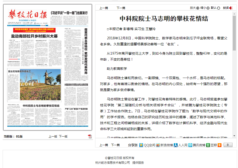 1212日,《攀枝花日报》以“中科院院士马志明的攀枝花情结”为题专题报道,文章详细内容见:
