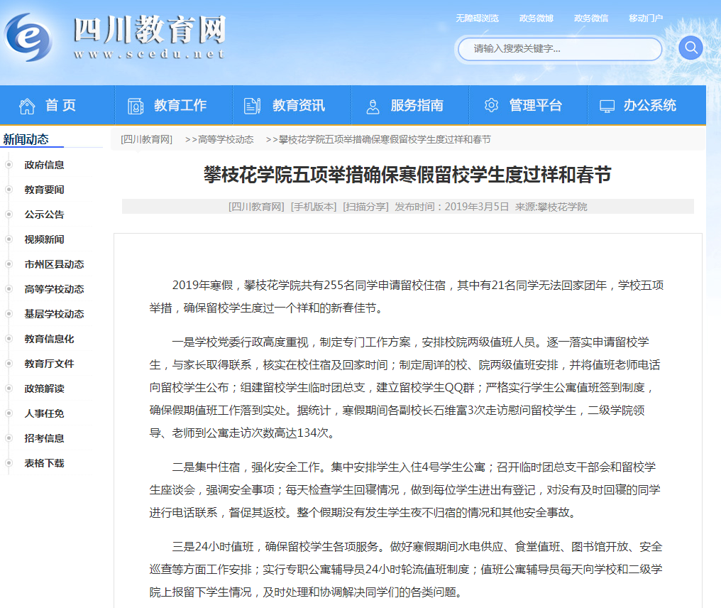 35日,四川教育网以《攀枝花学院五项举措确保寒假留校学生度过祥和春节》为题,从“学校党委行政高度重视,制定专门工作方案,安排校院两级值班人员”、“集中住宿,强化安全工作”、“24小时值班,确保留校学生各项服务”、“诚心陪伴,丰富活动献真情”等五项举措报道了我校寒假留校学生工作。