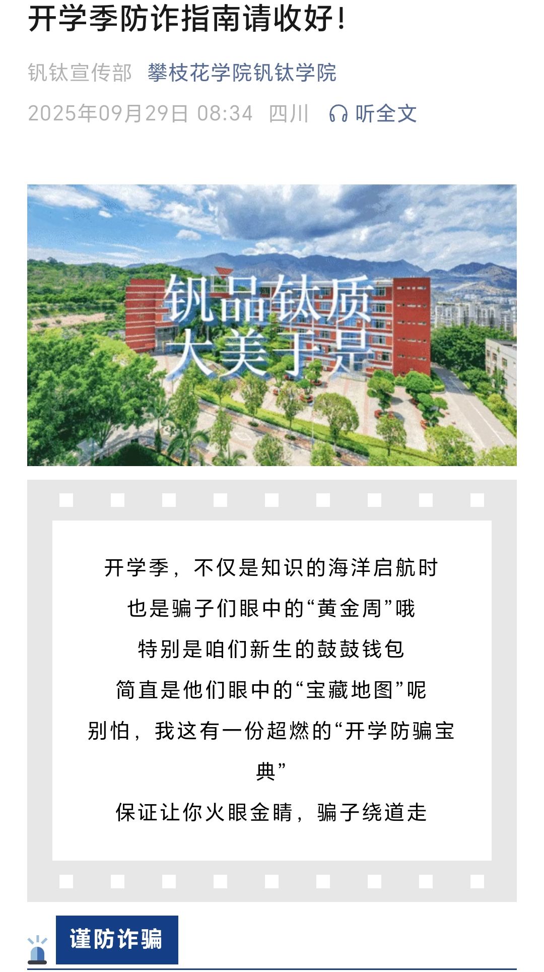 此次防诈宣传活动的开展,不仅让钒钛学院全体师生深入掌握了识别、防范诈骗的实用技能,更通过“全员承诺践诺”的形式,构建起“学院主导、学生参与、家庭联动”的校园防诈防护网。下一步,学院将持续把防诈教育纳入常态化安全教育体系,通过系统化、长效化的举措不断巩固宣传成效,切实守护师生财产安全与校园和谐稳定。