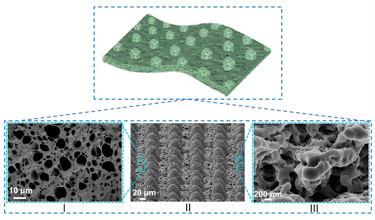 该成果将飞秒激光精密加工技术与模板转印方法相结合,制备出具有多孔半球型凸起微结构的聚二甲基硅氧烷薄膜和表面具有微结构的铜箔电极,并在此基础上成功构建了一种新型自供电压力传感器(PS-TENG)。该器件表面具有均匀分布的孔隙、周期性半球阵列及不规则纳米凸起,这种多尺度复合微纳结构显著提高了比表面积并降低了弹性模量,从而提升性能。进一步的有限元模拟揭示了结构尺寸与空间分布对器件形变及电荷转移效率的影响机制,理论分析结果与实验数据一致,验证了结构优化设计的合理性与有效性实验结果表面PS-TENG获得高灵敏度(0.87 V kPa¹)、检测范围(0.02–53.3 kPa)和快速响应速度(16.6 ms器件不仅电学性能和长期稳定性方面表现出色同时在复杂湿度环境下也展现出优异的环境适应性。