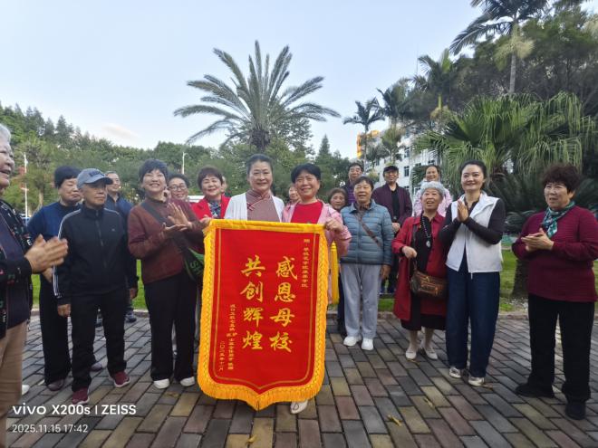 随后,校友们在康养学院院长兰玛、基础医学院党委书记王鹃的陪同下,前往东华山校区——即现在的攀枝花市卫校所在地。这里有他们求学追梦的起点,校园内那棵1974年种植于河门口卫校的棕榈树,更是勾起了众人的青春记忆。大家围站在树下,共同回忆往昔的点点滴滴。
