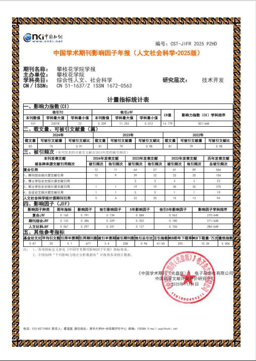 近日,中国知网公布了《中国学术期刊影响因子年报(人文社会科学·2025版)》。《攀枝花学院学报》复合影响因子0.791,同比增长43%;综合影响因子0.386,同比增长42%;影响力指数学科排名307位,提升159位,首次位于Q2区(前50%)CI学科排序、基金论文比、他引总引比、WEB即年下载率等其他指标也有明显提升。