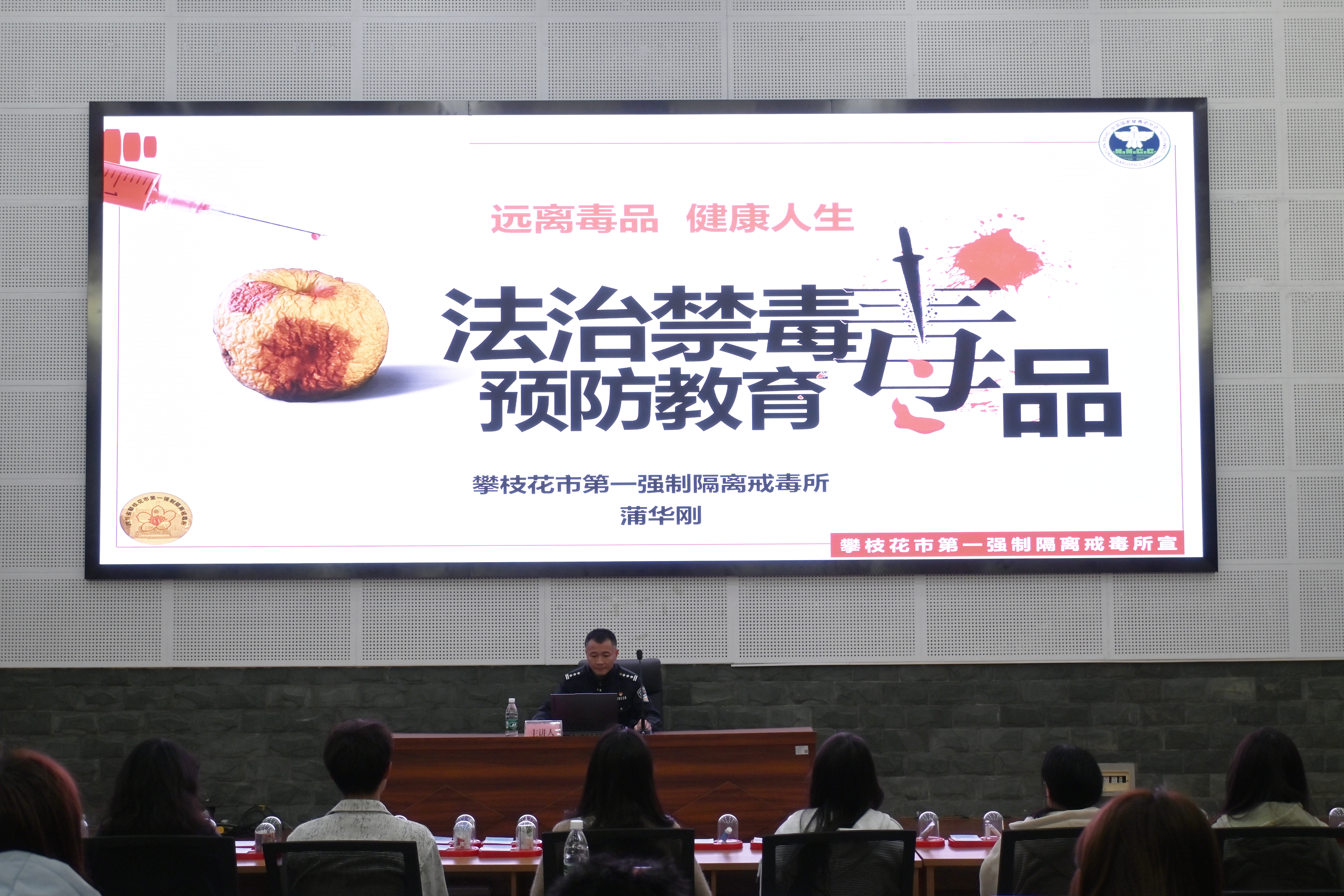 活动特邀攀枝花市第一强制隔离戒毒所医疗岗负责人蒲华刚担任主讲。他以林则徐“虎门销烟”的禁毒历史开篇,结合一线工作实录与真实案例,深入浅出地阐释了毒品的法律定义、传统与新型毒品的种类,特别是“奶茶包”“开心水”等伪装性极强的新型毒品。此外还生动剖析了毒品对身心健康的严重危害,揭示吸毒成瘾的生理与心理机制,并传授了实用的识毒防毒技巧。