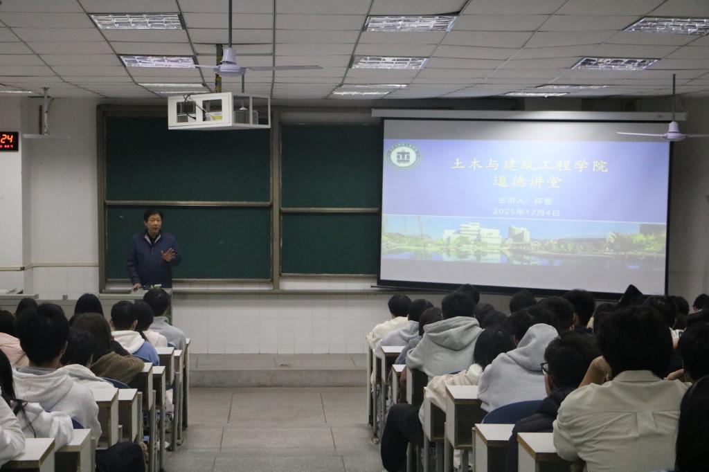 为进一步增强学生的专业自信,帮助学生进一步完善学涯规划,理清大学学习的方式方法,树立正确的世界观、人生观和价值观。12月4日晚,土建学院在CJ2-1教室举办2025年“传道授四十载,立德树人最后课”道德讲堂,学院大一、大二200余名学生参加活动。本次讲堂由学院高级辅导员、校心理中心兼职心理咨询师陈智主讲,学院党委副书记、纪委书记付建主持。